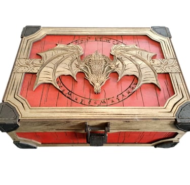 Diseñado en madera y pintado a mano conservando la esencia de la madera y sus vetas, para darle un toque de fuego y fantasía la tapa viene decorada con un detalle de dragón. Todo unido para hacer un cofre único para una partida legendaria.